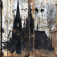 Dit werk vangt de gotische pracht van de Dom van Keulen, afgebeeld op een verweerd, industrieel oppervlak, een containerdeur. De zwarte silhouetten van de torens en de mysterieuze figuur op de voorgrond vormen een schril contrast met de roestige kleuren en graffiti-elementen. De scène lijkt op een donker sprookje dat zich afspeelt in een stedelijke ruïne. De vliegende vogels en abstracte krabbels versterken het gevoel van mysterie en rampspoed.