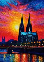 Deze afbeelding is een digitaal gestileerd schilderij van de Dom van Keulen, een beroemd gotisch monument in Duitsland. De kathedraal's torenhoge twee torenspitsen domineren de skyline, afgetekend tegen een dramatische zonsondergang met levendige tinten rood, oranje en blauw. De verlichte stadslichten en reflecties op de rivier…