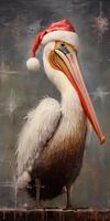 Een dominante Pelikaan met kerstmuts op. Breng de warmte van kerst in jouw huis met dit charmante werk!