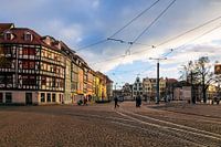 De foto toont een straatbeeld op het Domplein van Erfurt met links uitzicht op een rij kleurrijke vakwerkhuizen. De straat is geplaveid, wordt doorkruist door tramsporen en verlevendigd door voorbijgangers die zich door het beeld bewegen. De lucht is gedeeltelijk bewolkt, met blauwe gedeelten die het motief een open, heldere…