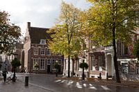 Het Domplein in Utrecht tegenover het academeigebouw in tegenlicht. De foto is genomen in de herfst wat te zien is aan het gekleurde blad van de bomen. de ramen van het monumentale pand weerkaatsen in straat die nog nat is van een regenbui.