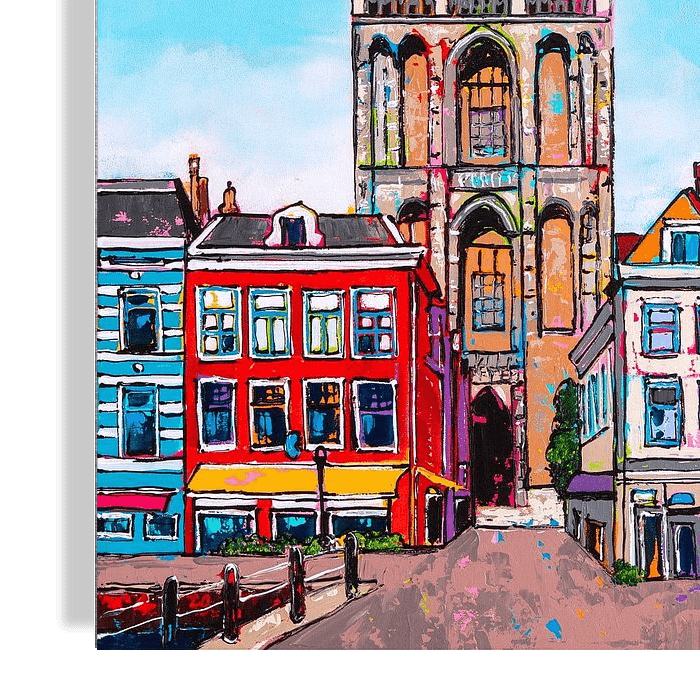 Dit prachtige schilderij brengt de iconische Domtoren tot leven, omgeven door kleurrijke huizen en de serene gracht.