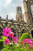 Domtoren en de Domkerk of Sint-Maartenskerk in Utrecht, tijdens een mooie de lentedag met bloemen in de voorgrond. Zicht vanuit de Pandhof tuin naast de kerk. De scherpte ligt op de bloemen in de voorgrond.