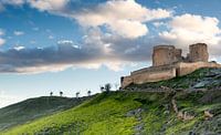 Uitzicht op verschillende oude windmolens voor een middeleeuws kasteel op de toeristische route van de Cervantes Mills (Don Quichot), in Spanje.