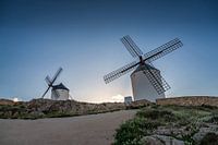 Uitzicht op verschillende oude windmolens op de toeristische route van de Cervantes Mills (Don Quichot), in Spanje.