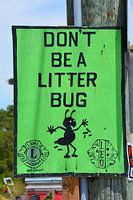Don't be a litter bug. Groen straatbord in Belize tegen zwerfafval