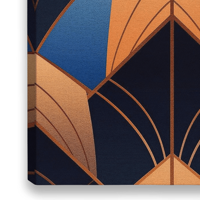 Een klassiek perzik oranje, zwart en royaal blauw motief. Dit werk is geïnspireerd door de vormen en het kleurenpallet van de Art Deco kunststroming van de jaren 20s. Het werk geeft een elegante en klassieke uitstraling aan uw interieur!
