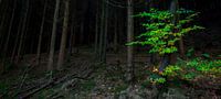 Panorama foto van een donker naaldbos, met daarin een groen accent van een loofboom.