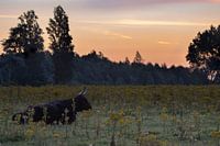 Aan het eind van de nacht ligt deze prachtig donker gekleurde Schotse hooglander op het grote veld van Landtong Rozenburg. De hemel kleurt prachtig bij de naderende zonsopkomst.