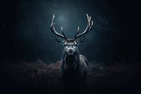 Het portret toont een hert in een sfeervolle duisternis, waar alleen een subtiele lichtstraal zijn hoofd verlicht. De schaduw omringt het dier met een geheimzinnige aura, terwijl het heldere licht zijn voorhoofd als een zachte gloed omhult. De donkere achtergrond accentueert de verfijnde details van het hert, van zijn imposante geweien tot de subtiele structuur van zijn vacht. Het contrast tussen licht en schaduw creëert een fascinerend beeld dat de aandacht trekt en de verbeelding prikkelt. Deze foto vangt een moment van ingetogen pracht, waarbij het hert lijkt te glanzen in zijn eigen, stille wereld.