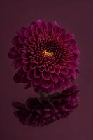 "Donker paars, rust en eenvoud: Stilleven met bloemen: de Chrysant" is een macrofoto van een bloem van de Chrysant (ook wel Kerstroos genoemd). Enkel de bloem van de plant is hier gefotografeerd, liggend op een spiegelend oppervlak. Door deze spiegeling krijgt het beeld iets spannends en aparts. De achtergrond en ondergrond lopen in elkaar over waardoor er een vlak ontstaat zonder horizon lijn. Dit maakt het beeld heel rustig en minimalistisch. Als je inzoomt op de bloem kun je mooi de details zien van dit werk.
