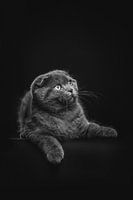 Donker portret van een Scottish fold kitten Bobby in de studio. De donkere kat poseerd tegen een mooie donkere achtergrond en de foto van dit dier is in zwart wit.