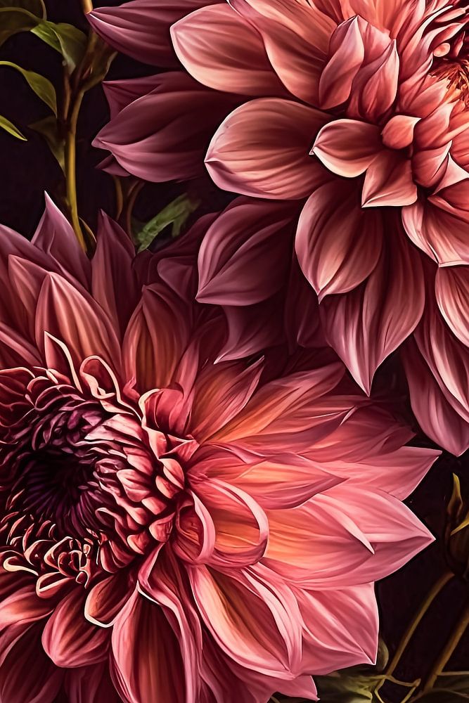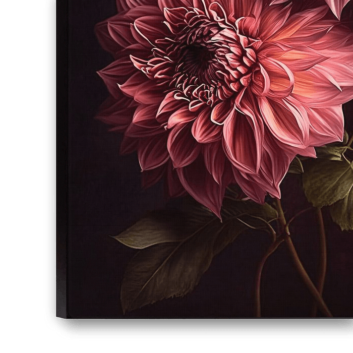 Deze klassieke illustratie toont twee donkerroze dahliabloemen op een zwarte achtergrond. De natuurlijke schoonheid van de bloemen contrasteert met de donkere achtergrond, waardoor een opvallende en elegante uitstraling ontstaat. Deze illustratie zou het perfecte accent zijn voor elke kamer in huis die een vleugje natuur nodig heeft.
