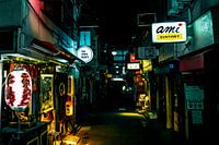 Donker steegje in de buurt van Shinjuku in Tokyo, Japan, tijdens de nacht. Dit steegje wordt verlicht door lantaarns en reclameborden en er zijn vooral bars en restaurantjes te vinden.