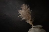 Donker stilleven met pampas rietpluimen in een grote stenen kruik. Het geheel staat voor een ruwe antraciet muur. Er is mooie licht inval vanuit een raam. Pampas pluimen worden veel gebruikt als decoratie in interieurs; maar ook als wanddecoratie prachtig! Het is een rustgevend beeld. Extra mooi om deze foto te combineren met mijn andere donkere stilleven foto’s!