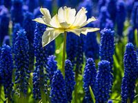 een witte bloem tussen al de kleine donker blauwe druifjes.