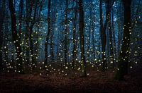 Een mysterieus donker sprookjesbos met vuurvliegjes.