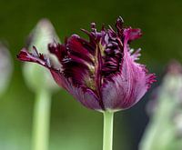 Deze Parkiettulp heeft een zeer fraaie kartelrand. De donkere kleur valt extra op wanneer ze tussen lichtgekleurde tulpen staat.
