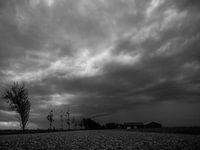 in de verte dreigen de donkere wolken, daar zal vast een heel hoop regen in zitten, ook met onweer. Het is een mooi tafereel zo op afstand. de boerderij mag wel oppassen dat de bliksem niet inslaat