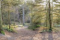 Pad in Donkere Duinen, het grootste bos in den Helder, met tegenlicht tussen de bomen. Sfeervol beeld op een wandelroute in het bos.