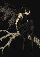 De afbeelding toont een melancholisch uitziende, donkere fee zittend op een knoestige tak bezaaid met druppels. Haar lange zwarte gewaden vloeien als schaduwen over het hout, terwijl haar haveloze vleugels en elfenoren haar mystieke afkomst benadrukken. De algehele indruk is somber, bijna onheilspellend, maar tegelijkertijd verleidelijk. De scène is in gedempte kleuren gehouden, wat de fijne lijnen accentueert en een mysterieuze sfeer creëert.