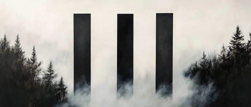 Donkere pilaren rijzen mysterieus op uit een zee van mist, omringd door schaduwrijke boomtoppen. Deze mysterieuze compositie straalt een fascinerend aura uit dat aanzet tot nadenken. Ideaal voor een woonkamer of kantoor, het creëert een sfeervolle achtergrond die zowel rust als inspiratie bevordert. Een werkelijk uniek kunstwerk dat de…
