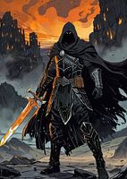 Dark Knight holding zwaard met ruïnes op achtergrond