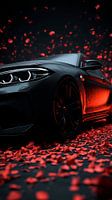 Een artistieke opname vanuit een lage hoek van een zwarte BMW coupé die rust op een bed van levendige rode rozenblaadjes. Een warme, vurige gloed weerkaatst op de carrosserie van de auto's en mengt agressie van de auto met intens, romantisch drama.