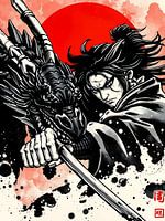 Een opvallende zwart-wit illustratie van een dreigende samoeraikrijger met een zwaard, verstrengeld met een draak, met krachtige lijnen en een rood accent.