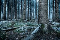 Donkere spookachtige winterse sfeer in een dennenbos met lichte sneeuwval op de bosbodem tijdens een koude mistige winterochtend in het Veluwse natuurgebied.