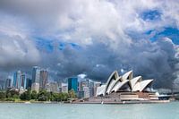 Op onze reis door Australië konden we natuurlijk niet om Sydney heen. Vanaf een van de vele veerponten zien we het Sydney Opera House en de skyline van het centrum van de stad. Erboven hangen donkere wolken terwijl het licht op de schelpen van dit spectaculaire staaltje architectuur vallen. De wolkenkrabbers steken af tegen de wolkenlucht met hier en daar een stukje blauwe lucht. Aan de voet van de wolkenkrabbers zie je de bomen van het stadspark naast het theater: de Royal Botanic Gardens. Een ferry vaart langs. Achter het Opera House ligt een grote cruiseboot in de baai van deze wereldstad.