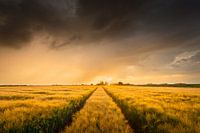 Een naderende onweersbui en de ondergaande zon zorgen voor een prachtige gouden gloed over deze akker vol gerst. Houd je van vergezichten, boeren landschappen of donkere wolken? Dan is deze foto echt iets voor jou.