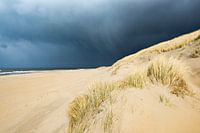 Donkere wolken van een binnen drijvende storm boven het strand van het Noord-Hollandse waddeneiland Texel in het vroege voorjaar.