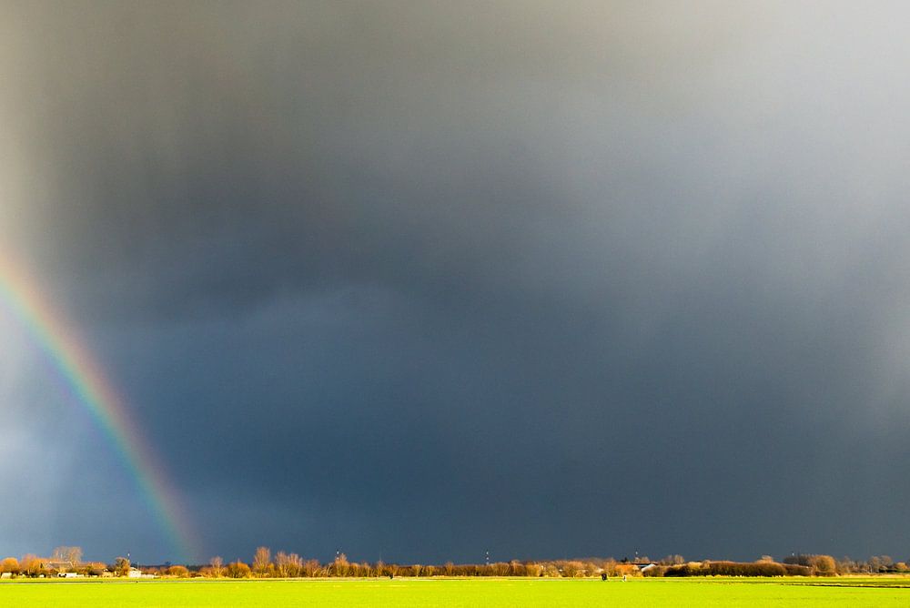 Een prachtige regenboog in combinatie met donkere regenachtige wolken na een onweersbui. Over de hele wereld gerekend vinden er naar schatting voortdurend 1800 onweersbuien plaats en ontladen er elke seconde 50 tot 100 bliksems.