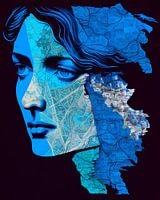 Het gezicht van een sterke vrouw, de kaartpatronen op haar gezicht symboliseren de reis die ze in het leven heeft gemaakt, haar worstelingen, haar overwinningen en haar vastberadenheid om door te gaan, wat er ook gebeurt.