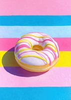Een donut met een gestreept wit en geel glazuur ligt tegen een sterk roze achtergrond met blauwe lijnen. De compositie is gebaseerd op sterke contrasten tussen pasteltinten en felle kleuren. Zachte schaduwen en fijne texturen benadrukken het driedimensionale effect van het glazuur en benadrukken de vorm van de donut. De compositie is helder, centraal en symmetrisch en plaatst de donut in het midden. De mix van kleurintensiteit, minimalistisch design en subtiele diepte creëert een moderne, grafische uitstraling met fotorealistische details.