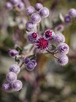 Close-up van de paars-rode bloemen van deze bijzondere distelsoort.