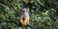 Dit doodshoofdaapje zit verscholen tussen de takken, alert maar ontspannen, met zijn grote ogen scherp gericht op de omgeving. De fijne lijnen van zijn vacht en de felgele armen steken prachtig af tegen het groen van de bladeren en het bruin van de boomstructuren. Zijn kleine handen grijpen behendig om een tak, terwijl het licht zacht door het bladerdak valt. Voor mij als fotograaf is dit een magisch moment, waarbij gedrag, omgeving en compositie samenkomen. Doodshoofdaapjes zijn snel en beweeglijk, dus het vraagt geduld en timing om ze zo scherp en natuurlijk in beeld te krijgen. Dit beeld toont niet alleen het dier, maar ook zijn leefwereld vol textuur, kleur en schaduw. Een intiem kijkje in het leven van een van de meest expressieve kleine apensoorten.