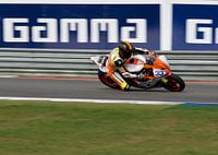 Een foto van een sport motor die door de bocht gaat