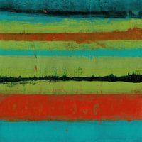 Dit vierkante abstracte werk in acryl op papier bestaat uit een reeks gelaagde, onregelmatige strepen gedrukt in helder groen, turquoise, roestig oranje, cyaan en donker blauwgroen. Licht en donker, warme en koele kleuren vormen contrasten.
