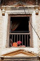 In een oud Newar huis in Nepal geniet een oudere vrouw van de eerste stralen van de ochtendzon. Achter een fijn gesneden houten raam, dat symbool staat voor de traditionele architectuur van de Kathmandu Vallei, vangt haar verweerde gezicht de zachte ochtendwarmte op.