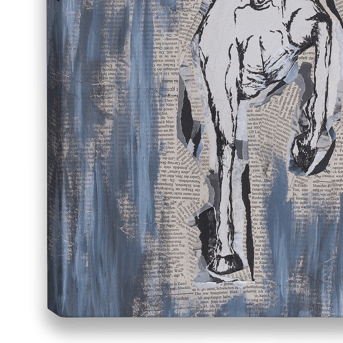 Het werk boeit door zijn driedimensionaliteit. Het paard, dat door de krantenmuur breekt, is gemaakt van stopverf en onderstreept daarmee de veeleisende hoofdrol. Op kantoor, in de eetkamer of in de grote zaal, het beeld is boeiend: gewoon overal waar een doorbraak nodig is!