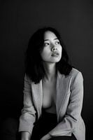 In tijdloze zwart-wit harmonie legt de foto een bedachtzame elegantie vast. De zachte lichtreflecties spelen rond het gezicht en benadrukken de contouren van de modieuze blazer. Dit portret straalt een stille kracht uit en is ideaal voor een stijlvolle woonkamer, waar het een gesprek kan stimuleren en inspiratie kan bieden.