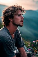 Een melancholisch moment te midden van een adembenemende natuur: een peinzende man, omringd door lieflijke berglandschappen en bloeiende bloemen, straalt rust en introspectie uit. De zachte kleuren en natuurlijke expressie geven dit kunstwerk een harmonieuze, ontspannen sfeer. Ideaal voor in de woonkamer om gesprekken te stimuleren en…