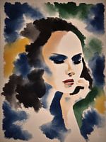 Dit portret van een vrouw legt een moment van diepe contemplatie en innerlijke rust vast. Het gezicht van de vrouw is lichtjes naar één kant gekanteld en haar ogen zijn gesloten of neergeslagen, wat een gebaar van contemplatie of rustig genieten overbrengt. Haar uitdrukking is zacht en vredig, benadrukt door de zachte gelaatstrekken en…
