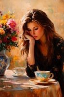 In een zacht kleurenspel lijkt de jonge vrouw in gedachten verzonken, haar vermoeide ogen weerspiegelen een bitterzoete melancholie. De weelderige bloemen in de vaas geven het moment een vleugje leven, terwijl het fijne theekopje, glinsterend en elegant, de stille contemplatie omlijst. Het is een magisch moment van pauze.