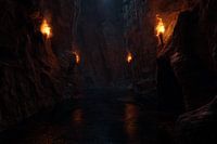 Doorgang door een donkere grot verlicht door brandende fakkels