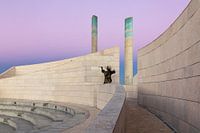 Gebouw in moderne architectuur van de Champalimaud Foundation in Lissabon gefotografeerd op het blauwe uur.