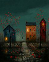 De kasseien zijn koud en diep, Waar karmozijnrode klaprozen ontwaken uit hun slaap. Onder een loodgrijze hemel, Heerst een stilte zo hard als steen en zo dicht als een zegel. Drie huizen staan in de schemering, Geen menselijk gezicht is te zien. Maar amberkleurige ramen branden zachtjes, Voor hen die vertrekken en hun beurt doen. De…