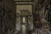 Door een oude vervallen gang vol met graffiti, in een verlaten fort in België, kijk je naar buiten